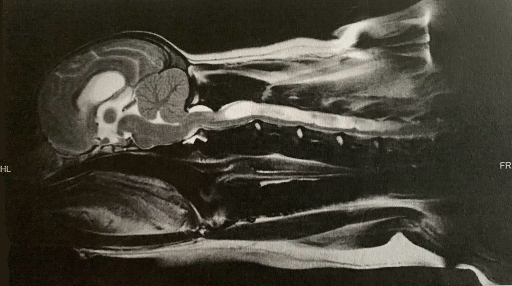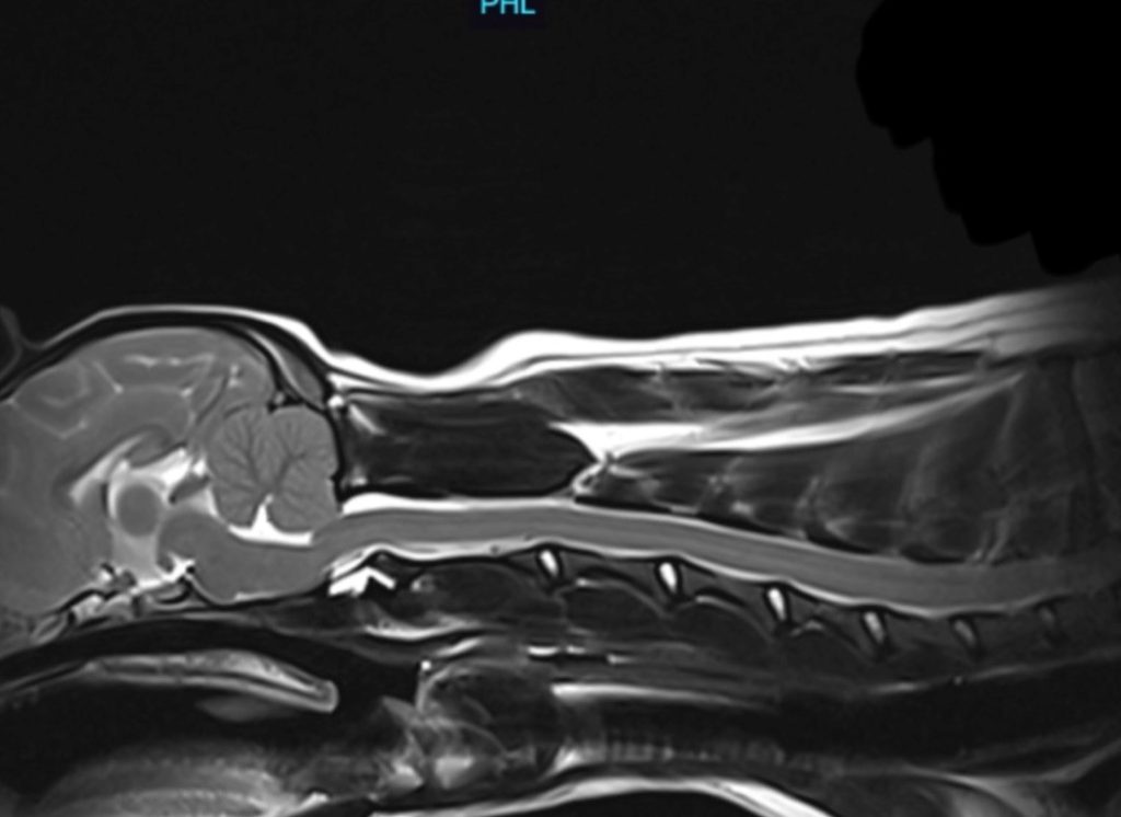 CMs may develop when the bony space, caudal occipital bone, is smaller than normal, causing the cerebellum and brain stem to be pushed downward into the foramen to the level of the foramen magnum (mild CM) or through the foramen magnum (severe CM) into the upper spinal canal. The resulting pressure on the cerebellum and brain stem may affect functions conrolled by these areas and block the flow of cerebrospinal fluid (CSF)–the clear fluid that surrounds and cushions the brain and spinal cord going to and from the brain. Many dogs with CM go on to develop syringomyelia (SM). As described above, Syringomyelia is a condition where herniations form along the spinal canal.
